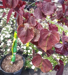 - Purple Leafed Redbuds - The flowers of Redbuds are true harbingers of spring. There are many varieties of Redbuds, and the purple leafed varieties are very popular. Their purple leaves make a striking addition to any landscape, but these trees are highly susceptible to a type of fungal wilt that has no cure. It causes die-back in branches, attracts secondary infections, and will eventually kill the trees. Properly locating purple leafed Redbuds in well drained non-irrigated sites will help in managing the disease. Oftentimes, trees come infected directly from the nursery. Look for malformed leaves which can be an indicator of serious problems (pictured on the right).